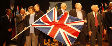 | On the Saturday evening is the Gala Dinner and the medal presentation with over 500 fanciers and partners attending the evening. This is unique to COM as fanciers attending from each country are called to the stage to be presented with their national flag while their national anthem is being played. This year we had about 20 British fanciers attending and we all went up to the stage. It is always so wonderful to be part of the family of nations sitting together and enjoying each others company. The speaker also announced the number of medals each country has won and it was announced that we, COM-UK, had won 9 medals consisting of 4 gold, 2 silver and 3 bronze medals, the same total number as last year. It is only natural that the host country tends to do well as Belgium had the largest team and of course the largest number of medals. |