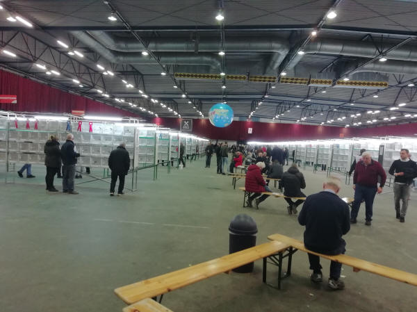 One needs to pay tribute to the conveyors from those countries benching birds as they take 2 weeks of their time to drive their country’s teams to the show venue and then spend every day stewarding by feeding and watering a section of the show birds allocated to them and do all the necessary stewarding jobs. It is a thankless task but they do it for the love of the hobby and we should be extremely grateful to them for carrying out this task on our behalf. Our conveyors this year were Richard Lumley, our COM-UK president, together with the Irish conveyor Peter Sherlock who took our northern team on Wednesday 2nd January crossing from Hull to Hook of Holland then driving to the show hall while Gary Mann took the team from the south crossing from Dover then driving all the way to Zwolle and back to Bournemouth, Dorset in the same day. On behalf of COM-UK and all the exhibitors we would like to say a big THANK YOU to both Richard and Gary for their excellent effort in carrying out this thankless task. Also we must not forget the dedication of Willie McKay who travelled all the way from Whitburn, Scotland to take his 8 birds to Richard in Norton, North Yorkshire and back in the same day and donating all the biscuits for the COM-UK stand at the show. This is dedication to be commended indeed.